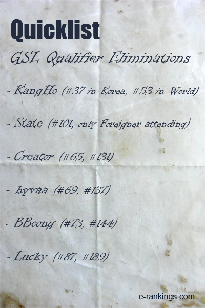 GSL Code A Qualifiers were held today at Intel e-Stadium in Seoul. More than a 100 players attended the event, 36 of them qualfied for the League which equals the WCS Challenger league of Europe and America. Some did not make it though you would have thought otherwise. Here is a quicklist of all prominent eliminations.