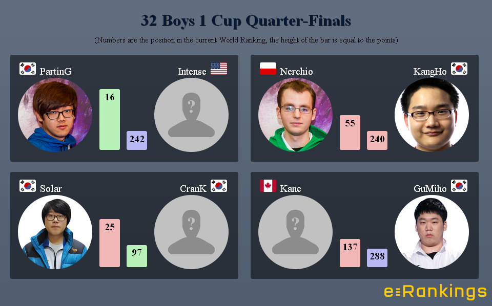 Many players have perished from the „32 Boys 1 Cup“ tournament since we took a look at the contestants a month ago, but [parting] is still the biggest favourite amongst the remaining eight. The final part of the tournament will be played this weekend. Up to now all players have won 50 dollars, but one will go to bed on Sunday and be $1,000 dollar richer. These are the matches of the quarter-finals.