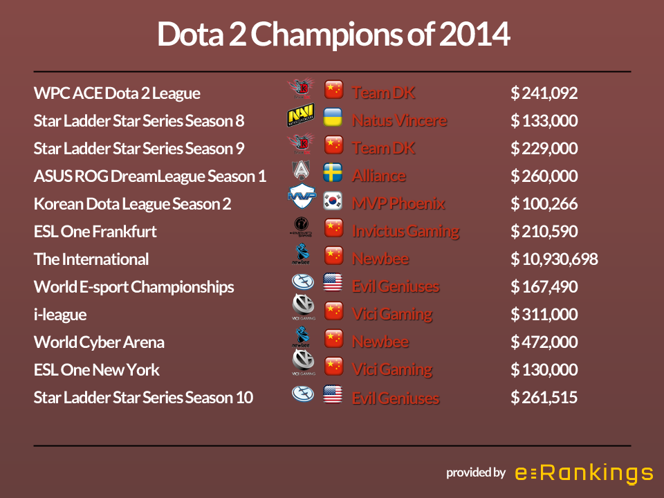 Chinese teams dominated competitive Dota 2 in 2014. They won seven out of the twelve most important tournaments and took home million dollars in prize money. Here are all the champions of these years global tournaments.